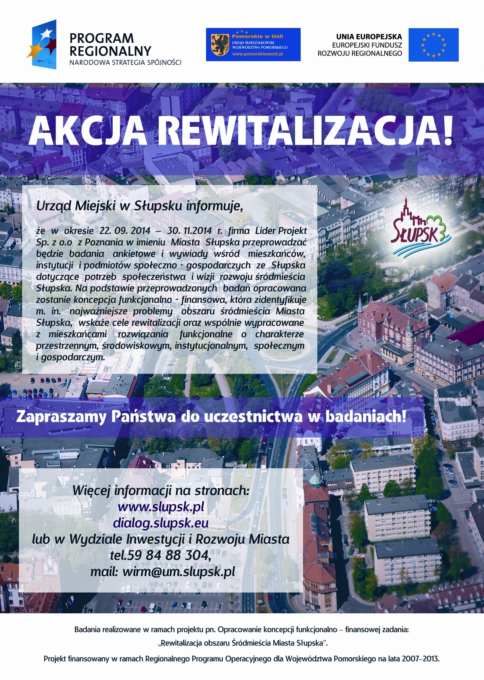 W związku z przystąpieniem Miasta Słupska do realizacji projektu pn. „Opracowanie koncepcji funkcjonalno – finansowej zadania: „Rewitalizacja obszaru Śródmieścia Miasta Słupska” i podpisaniem umowy z firmą Lider Projekt Sp. z o.o. z Poznania, na wykonanie tejże koncepcji Wydział Inwestycji i Rozwoju Miasta Urzędu Miejskiego w Słupsku informuje, że w okresie od września br. do końca listopada 2014 r. prowadzone będą spotkania, wywiady i badania ankietowe wśród mieszkańców i podmiotów społeczno-gospodarczych z terenu miasta oraz obszaru wskazanego do rewitalizacji, obejmującego następujące ulice: Deotymy, Plac Zwycięstwa, Władysława Jagiełły, Jana Pawła II, Zamkowa, Prosta, Płowiecka, Tadeusza Sygietyńskiego, Ogrodowa, Długa, Polna, Stefana Jaracza, Witolda Lutosławskiego, Juliusza Słowackiego. Przedstawiciele firmy Lider Projekt Sp. z o.o. posiadać będą upoważnienia do działania w imieniu Miasta Słupska. Zwracamy się do Państwa z prośbą o aktywną współpracę, udział w badaniach i ankietach oraz zgłaszanie ankieterom wszelkich problemów, z którymi się Państwo spotykacie na co dzień w Waszej okolicy oraz propozycji zmian dotyczących przestrzeni publicznej oraz działań na rzecz społeczeństwa.